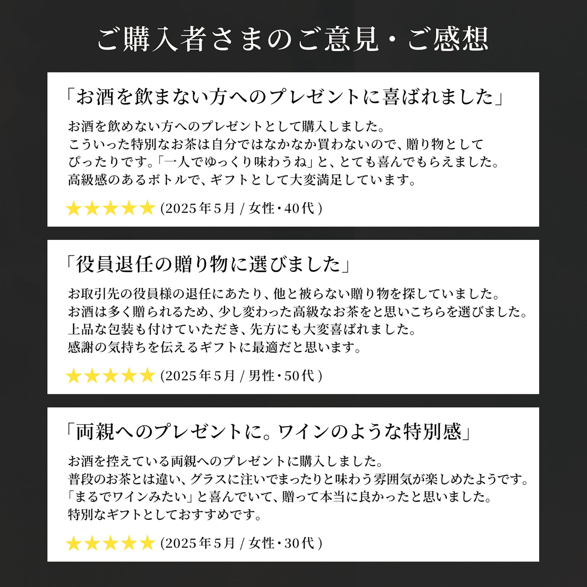 ゴッダス玉露の存在をトワイライトエクスプレス瑞風の動画で知ってから気になっていました。先日夫の還暦のお祝いに思いきって購入しました。夫はお酒が飲めないのでゴッタスをワイングラスに注いでお祝いしました。甘みがあって豊潤な香りで美味しかったです。少し氷を入れると更に美味しかったです。瓶もお洒落なワインボトルのような感じなので、一輪挿しとして使っています。親友の還暦祝いにも贈ろうと思っています。