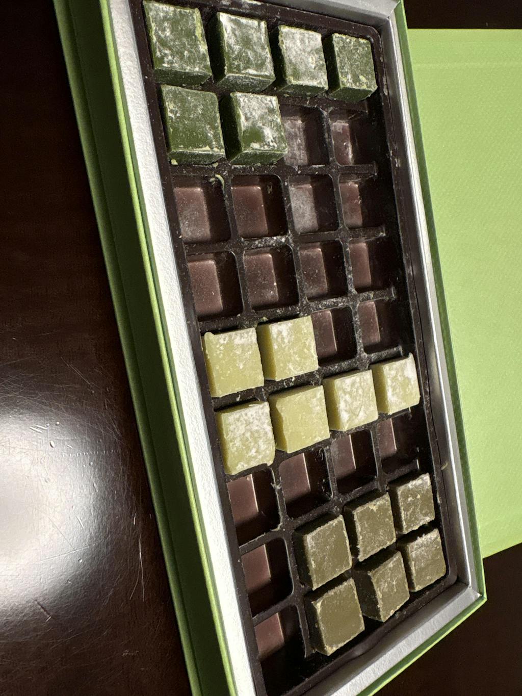 ・原材料名:抹茶チョコ(ホワイトチョコレート(ベルギー製造)、クリーム、ココアバター、粉末水あめ、抹茶、粉糖/乳化剤、バニラ香料)、シャインマスカット抹茶(ホワイトチョコレート(ベルギー製造)、クリーム、ココアバター、粉末水あめ、マスカットペースト、抹茶、粉糖/乳化剤、香料、着色料(ベニバナ黄、クチナシ)、酸味料)、ほうじ茶チョコ(ホワイトチョコレート(ベルギー製造)、クリーム、ココアバター、粉末水あめ、ほうじ茶、粉糖/乳化剤、バニラ香料)、(一部に乳成分・大豆を含む)