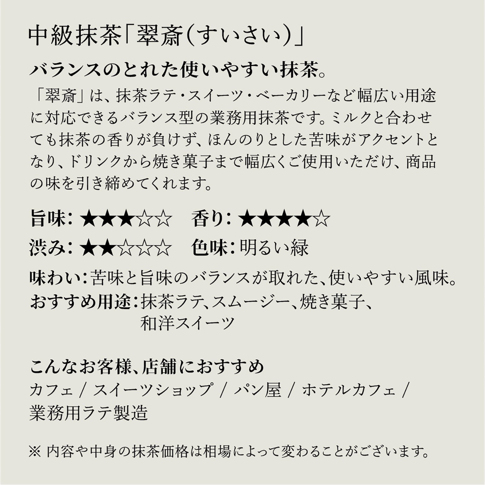 バランスのとれた使いやすい抹茶。 「翠斎」は、抹茶ラテ・スイーツ・ベーカリーなど幅広い用途に対応できるバランス型の業務用抹茶です。ミルクと合わせても抹茶の香りが負けず、ほんのりとした苦味がアクセントとなり、ドリンクから焼き菓子まで幅広くご使用いただけ、商品の味を引き締めてくれます。